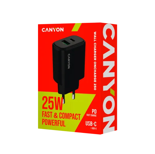 Power up smarter with the OnCharge 250, a compact yet high-performance wall charger designed to keep up with your fast-paced life. With dual ports – a USB(C) for ultra-fast PD charging and a USB-A for broad compatibility – this charger enables you to power two devices at once, so there’s no need to swap cables or wait for a free outlet. Equipped with 25W of total power, it delivers rapid, efficient charging for your latest smartphones, tablets, and more. The USB(C) port supports PPS (Programmable Power Supply), dynamically adjusting voltage and current to maximize speed while protecting battery health. Meanwhile, the USB-A port delivers up to 18W of power, perfect for older devices or accessories. Engineered for safety, the OnCharge 250 also features built-in protection against overvoltage, overheating, overcurrent, and short circuits, so you can charge with complete confidence. Its sleek black design pairs easily with any setup, whether at home, in the office, or on the go. No more waiting or hassle – efficient, intelligent, and reliable charging is right here, a couple clicks away.