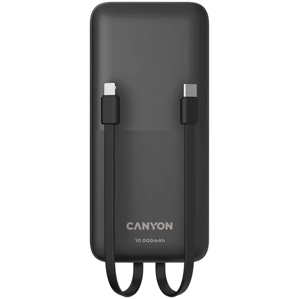 Get the ultimate power bank that's tailored to your needs. Canyon PB-1010 is fully loaded: there's Power Delivery, Quick Charge 3.0, and Smart IC with six types of protection. It features a dual Type C and MicroUSB power input – even your older cables might be put to use here. Both ports are capable of up to 18W, thus reducing the charging time. Quite handy if you're always on the go. What about the outputs? Oh, there are plenty: two ports and two built-in cables. The USB-C output port is a 20W PD, and USB-A can deliver 22.5W of juice. Now, the cables! Two cables are designed with usability in mind and won’t just hang there: they seamlessly fit into the notches on the body. One cable is Type C, and the other is Lightning. Back to the Smart IC technology – it detects your device, optimizes voltage, and safeguards against short circuits and overheating. Being lightweight, this 10000mAh power bank can charge your phone up to three times faster. It's a reliable power source fitting into your pocket.