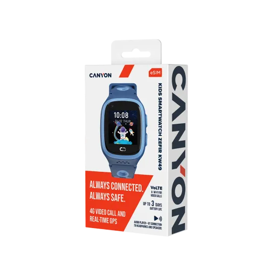 The Zefir KW49 is a safe, fun, and reliable way to stay connected with your child anywhere. With 4G VoLTE support, GPS tracking, and video calling, parents can have peace of mind knowing their child is always within reach, while kids get a device designed just for them. Great for both quick check-ins or longer chats, the KW49 supports video calls, voice chat, and messaging over 4G and Wi-Fi. Parents can add up to 50 trusted contacts and use the white list feature to block unknown numbers, ensuring that only safe, familiar voices reach your child. With the built-in SOS function, your child can call for help with just one press. Real-time GPS, Wi-Fi, and LBS tracking let you monitor their location with precision. You can also set up safe zones and receive alerts if your child leaves designated areas. And because the KW49 supports sharing access, both parents can stay connected and in control at the same time. The KW49 is packed with educational mini-apps, fun games, and even an audio player with 1GB of memory for favorite songs and stories. Parents can lock or unlock apps like games, the gallery, or music depending on the moment through the Canyon Life app, which provides complete control over when it’s time to learn, play, or focus. The watch includes a pedometer to track activity, a silent call mode for quiet moments, and even remote photo capture for little surprises. With BT 5.0, kids can connect to wireless earbuds or a speaker for music on the go. Designed to keep up with active kids, the Zefir KW49 is IP67 waterproof and designed to withstand splashes, rain, and everyday adventures. The 900 mAh battery lasts up to 3 days, so you won’t need to worry about charging every night. Featuring a 1.44'' IPS screen with vibrant colors, a simple menu, and a lightweight body, the KW49 is comfortable and easy for kids to use. It’s powered by a reliable Unisoc chipset, combining stability with responsive performance.