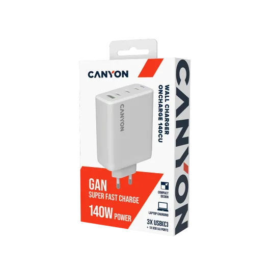 Meet OnCharge 140ACC, the ultimate solution for your charging needs. Built with cutting-edge GaN technology, this high-performance wall charger packs 140W of power into a compact, travel-ready design. It's your all-in-one product for staying connected and powered up. With four ports, including three USB Type C and one USB (A), you can charge up to four devices simultaneously without sacrificing speed. No matter the device you need to charge, the OnCharge 140ACC has the resources to keep your tech running smoothly. Thanks to its massive power capacity, this charger effortlessly handles energy-hungry devices like laptops, so you can power up quickly and get back to what matters. Despite its might, the OnCharge 140ACC is very compact. It’s small enough to slip into your bag, yet strong enough to be your tech lifeline whether you’re at home, in the office, or on the go. With four layers of safety features – Overvoltage, Overheating, Overcurrent, and Short Circuit Protection – you can trust it to safeguard your devices every time you plug in. Of course, it’s CE RoHs and ERP compliant, meeting the highest standards of safety and efficiency. From lightning-fast charging to travel-friendly design, the OnCharge 140ACC is the charger that delivers the best.
