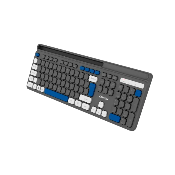 The Canyon HKB-W03 wireless keyboard is your ticket to freedom from cords and clutter. This keyboard is all about sleek design and smart functionality, giving you the power to work and play with ease. With a full-sized layout and 105 keys, including handy multimedia shortcuts, this Canyon keyboard is your trusty sidekick for any task. The scissor frame switches provide a satisfying typing experience, ensuring that every keystroke is smooth and quiet. Plus, the slim and ergonomic design of Canyon HKB-W03 makes it so easy to type on. We used a matt UV finish and laser engraving to keep it looking mint for as long as possible. Powered by a single AAA battery, this keyboard is ready whenever you are. The tilted feet with a rubberized base offer stability and comfort so you can focus on your work. Experience seamless wireless typing with HKB-W03. It's time to take control of your workspace!