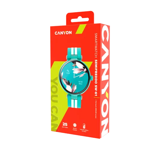 With Canyon SW-61, everything is under control. First and foremost, it tells time! Second, sync it with your smartphone to receive calls and push notifications. You can control music playback and release the smartphone camera shutter. You can get in the water – the IP68 standard protects this watch. It happily monitors your heart rate, blood pressure and sleep, counts steps, and reminds you to drink water. There are 25 sports modes to keep track of the calories burnt. Choose from 25 languages and dozens of watch faces – the device is fully customizable. The best thing is: you don’t have to charge it every night — the SW-61 model lasts 5** to 11* days in active mode. We bet you wouldn’t want to leave home without this smartwatch! Please note that we care about your privacy — the Canyon smartwatch follows the GDPR standard and protects your personal data.