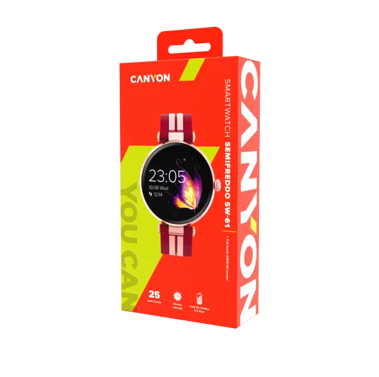 With Canyon SW-61, everything is under control. First and foremost, it tells time! Second, sync it with your smartphone to receive calls and push notifications. You can control music playback and release the smartphone camera shutter. You can get in the water – the IP68 standard protects this watch. It happily monitors your heart rate, blood pressure and sleep, counts steps, and reminds you to drink water. There are 25 sports modes to keep track of the calories burnt. Choose from 25 languages and dozens of watch faces – the device is fully customizable. The best thing is: you don’t have to charge it every night — the SW-61 model lasts 5** to 11* days in active mode. We bet you wouldn’t want to leave home without this smartwatch! Please note that we care about your privacy — the Canyon smartwatch follows the GDPR standard and protects your personal data.