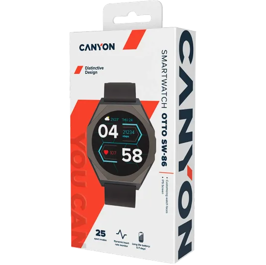 ''Otto'' is a distinct smartwatch created by Italian designer. It’s unique shape with octagon bezel is able to perfectly emphasize your dynamic individuality and style. It will tell time and weather and receive notifications on calls and messages – just sync it with your smartphone. There are 25 sports modes, swimming included: this watch is waterproof by the IP68 standard. It can monitor your heart rate, blood pressure, sleep, count steps, and remind you to drink water. Control your music playback and camera right from the wrist. Choose from six watch faces or download new ones – the device is fully customizable. And you don’t have to charge it daily because Otto lasts up to 8 days in active mode! With this smartwatch, you can stay focused on important things in life. Please note that we care about your privacy — the Canyon smartwatch follows the GDPR standard and protects your personal data.